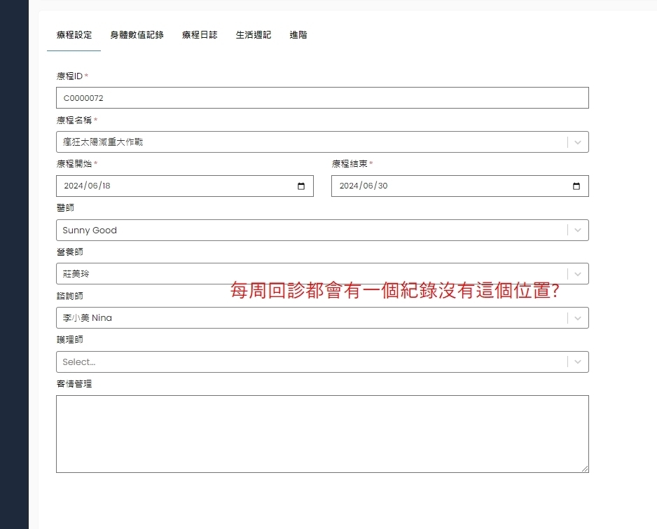 進行中[後台] 美玲反應每周回診都會有一個記錄沒有這個位置 ?